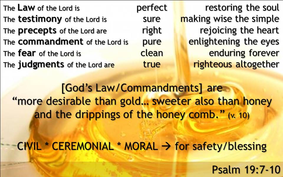 The Law is not only better than absolute finest gold, but it’s “sweeter also than the sweetest honey and drippings of the honeycomb.” And finally, David envisions, recognizes there is “great reward” by keeping the Law—implicitly, that the Law offers a far better reward than any other reward he might seek.