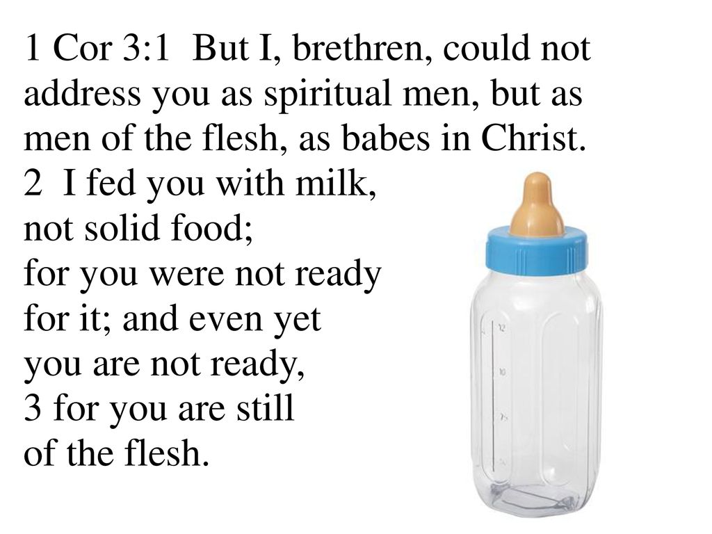 3 However, brothers and sisters, I could not talk to you as to spiritual people, but [only] as to [a]worldly people [dominated by human nature], mere infants [in the new life] in Christ! 2 I fed you with milk, not solid food; for you were not yet able to receive it. Even now you are still not ready. 3 You are still [b] worldly [controlled by ordinary impulses, the sinful capacity]. For as long as there is jealousy and strife and discord among you, are you not [c]unspiritual, and are you not walking like ordinary men [unchanged by faith]? 4 For when one of you says, “I am [a disciple] of Paul,” and another, “I am [a disciple] of Apollos,” are you not [proving yourselves unchanged, just] ordinary people?