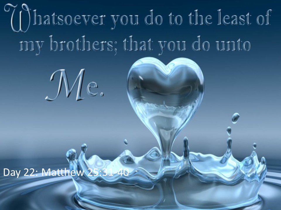 37 “Then the righteous will answer Him, ‘Lord, when did we see You hungry and feed You, or thirsty and give You something to drink? 38 When did we see You a stranger and take You in, or without clothes and clothe You? 39 When did we see You sick, or in prison, and visit You?’