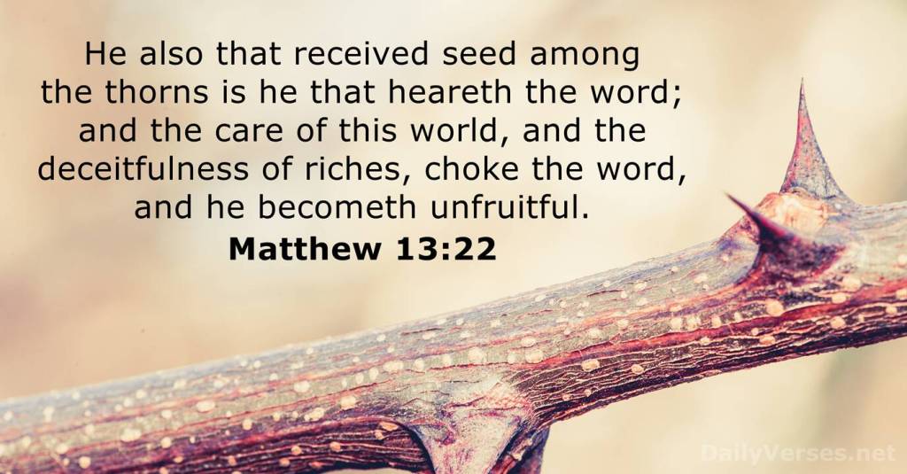 22 And the one on whom seed was sown among the thorns, this is the man who hears the word, and the worry of the [a]world and the deceitfulness of wealth choke the word, and it becomes unfruitful. 23 And the one on whom seed was sown on the good soil, this is the man who hears the word and understands it; who indeed bears fruit and brings forth, some a hundredfold, some sixty, and some thirty.”