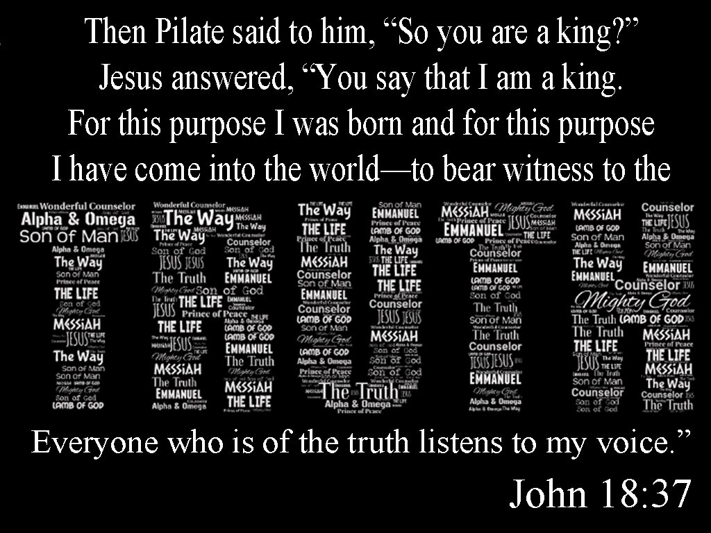 37 So Pilate said to Him, “Then You are a King?” Jesus answered, “You say [correctly] that I am a King. This is why I was born, and for this I have come into the world, to testify to the truth. Everyone who is of the truth [who is a friend of the truth and belongs to the truth] hears and listens carefully to My voice.” 38 Pilate said to Him [scornfully], “What is truth?”