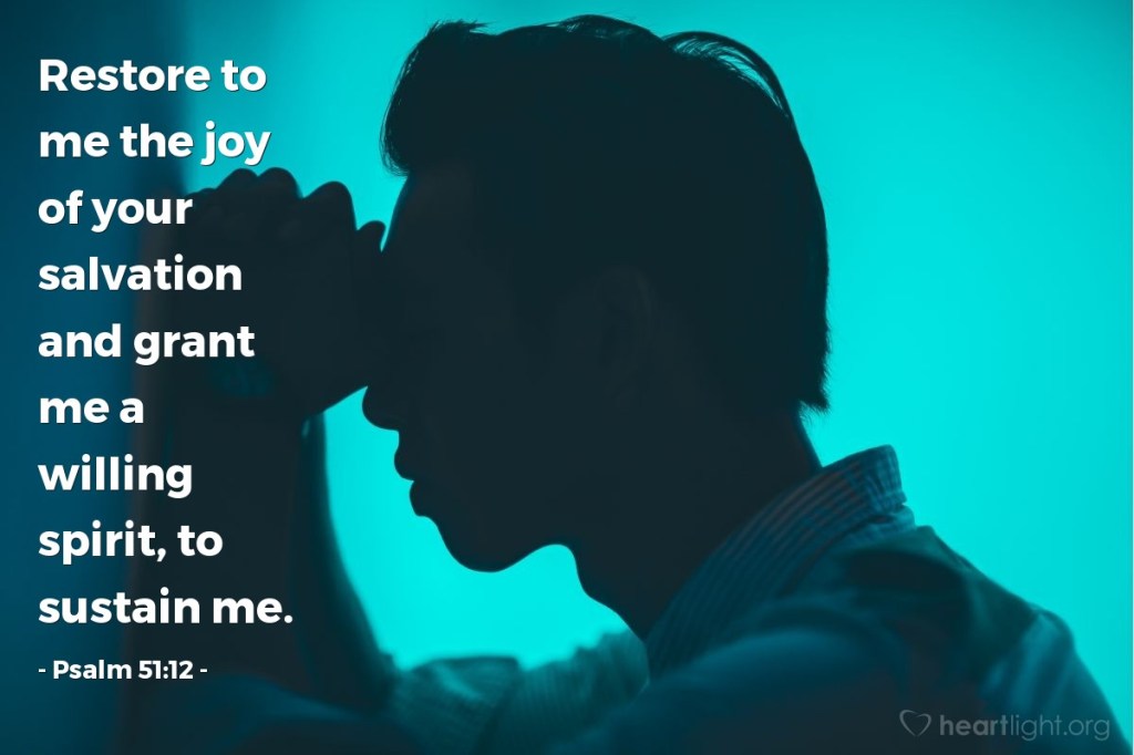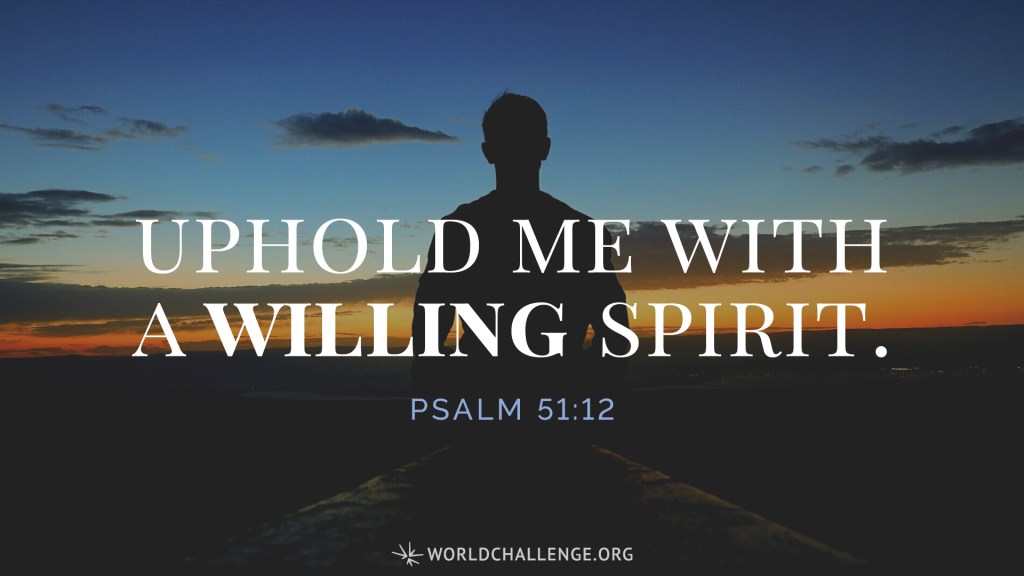 David’s request to be sustained (thoroughly supported) with a willing spirit (a heart quick and ready to respond) could be viewed as a culmination of the Lord creating in him a clean heart, giving him an unwavering spirit of obedience, not grieving the Holy Spirit (Ephesians 4:30) and a restoration, renewal of his joy.