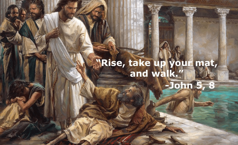 2 Now in Jerusalem, near the Sheep Gate, there is a [a]pool, which is called in Hebrew (Jewish Aramaic) Bethesda, having five porticoes (alcoves, colonnades). 3 In these porticoes lay a great number of people who were sick, blind, lame, withered, [b][waiting for the stirring of the water; 4 for an angel of the Lord went down into the pool at appointed seasons and stirred up the water; the first one to go in after the water was stirred was healed of his disease.] 5 There was a certain man there who had been ill for thirty-eight years. 6 When Jesus noticed him lying there [helpless], knowing that he had been in that condition a long time, He said to him, “Do you want to get well?” 7 The invalid answered, “Sir, I have no one to put me in the pool when the water is stirred up, and while I am coming [to get into it myself], someone else steps down ahead of me.” 8 Jesus said to him, “Get up; pick up your pallet and walk.” 9 Immediately the man was healed and recovered his strength, and [c]picked up his pallet and walked.