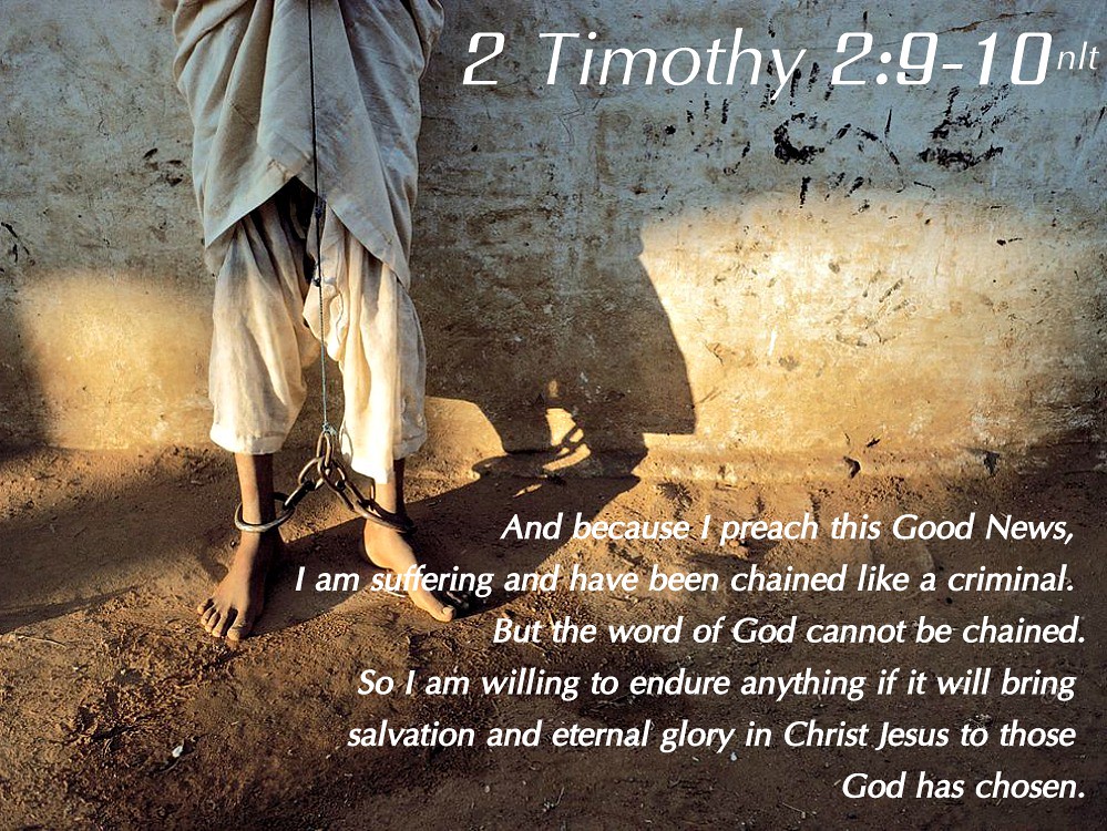 8 Remember Jesus Christ, risen from the dead, descendant of David, according to my gospel, 9 [a]for which I suffer hardship even to imprisonment as a criminal; but the word of God is not imprisoned. 10 For this reason I endure all things for the sake of those who are chosen, so that they also may obtain the salvation which is in Christ Jesus and with it eternal glory. 11 It is a trustworthy statement: