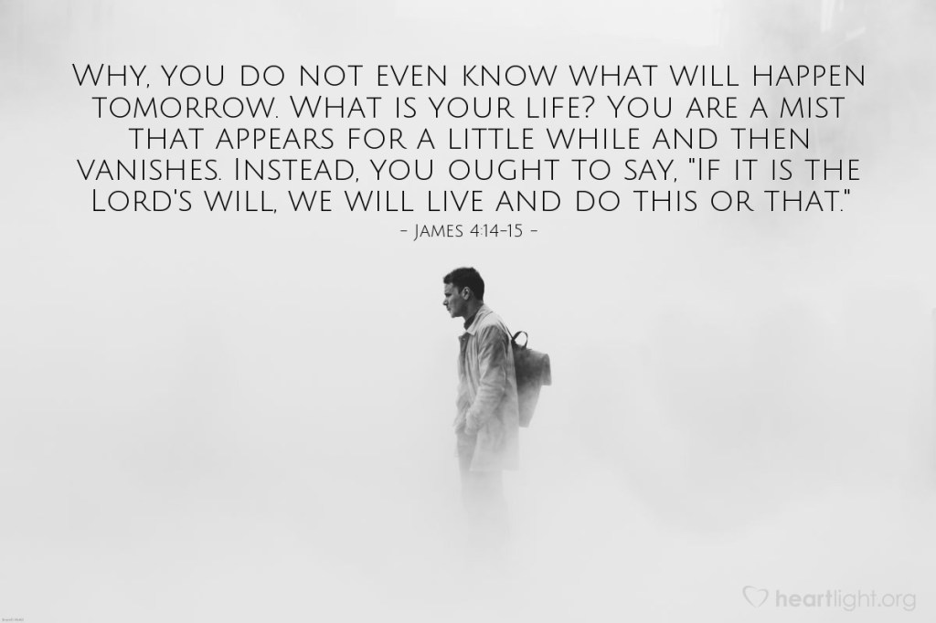 “Come now, you who say, ‘Today or tomorrow we will go into such and such a town and spend a year there and trade and make profit’—yet you do not know what tomorrow will bring. What is your life? For you are a mist that appears for a little time and then vanishes. Instead you ought to say, ‘If the Lord wills, we will live and do this or that.’ As it is, you boast in your arrogance. All such boasting is evil. So whoever knows the right thing to do and fails to do it, for him it is sin” (James 4:13–17).