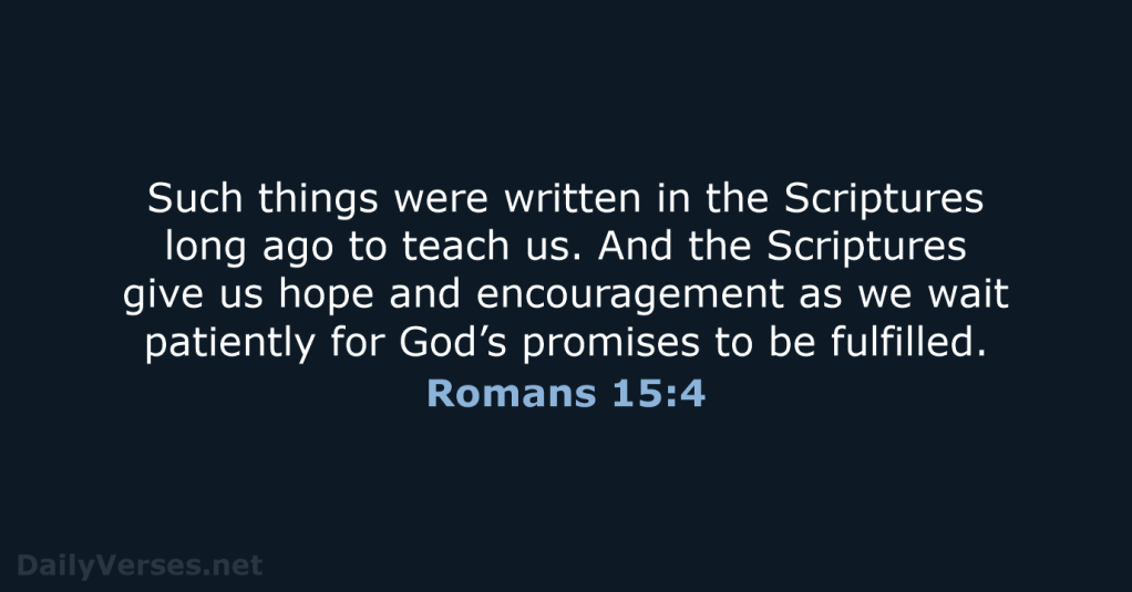 Romans 15:4 is a powerful cutting edge reminder of the importance of engaging with the scriptures as a source of faith, hope, comfort, patience for believers.