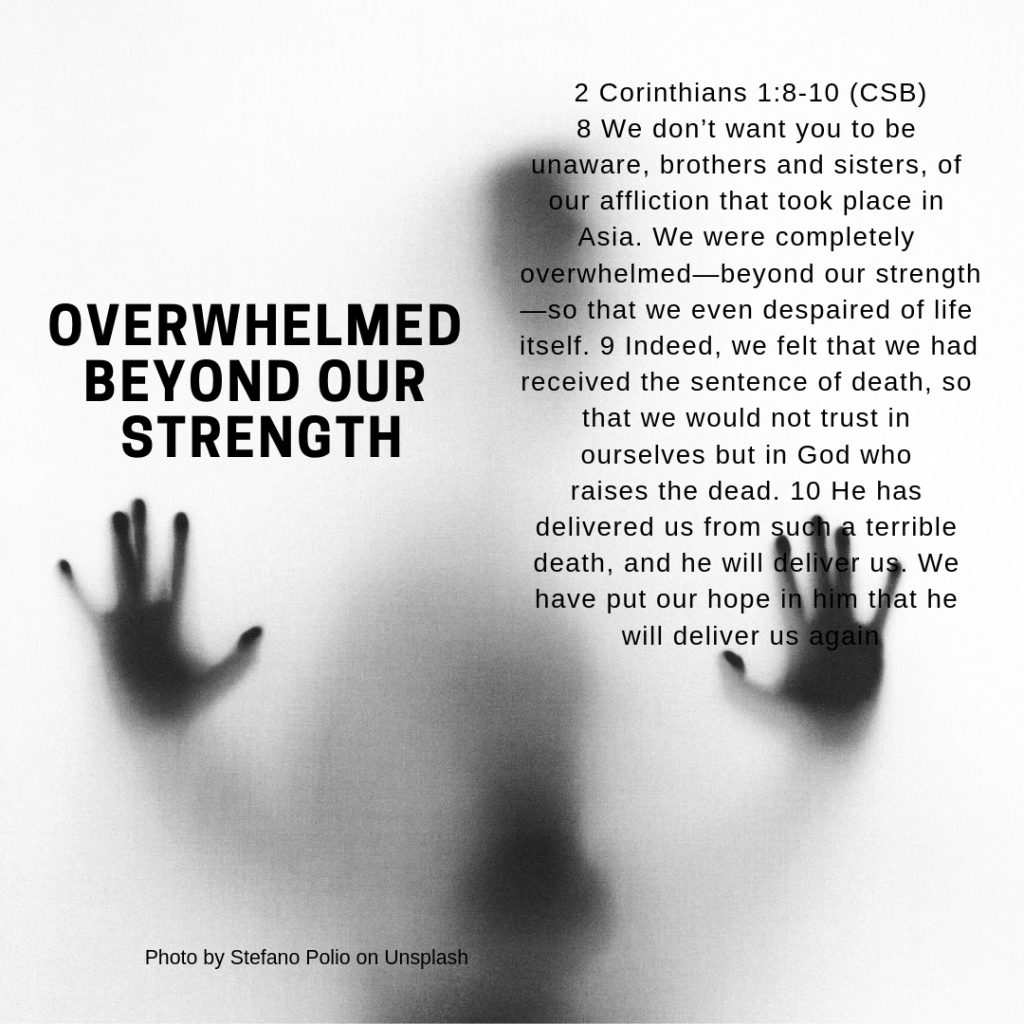 8 For we do not want you to be unaware, brothers,[a] of the affliction we experienced in Asia. For we were so utterly burdened beyond our strength that we despaired of life itself. 9 Indeed, we felt that we had received the sentence of death. But that was to make us rely not on ourselves but on God who raises the dead. 10 He delivered us from such a deadly peril, and he will deliver us. On him we have set our hope that he will deliver us again.