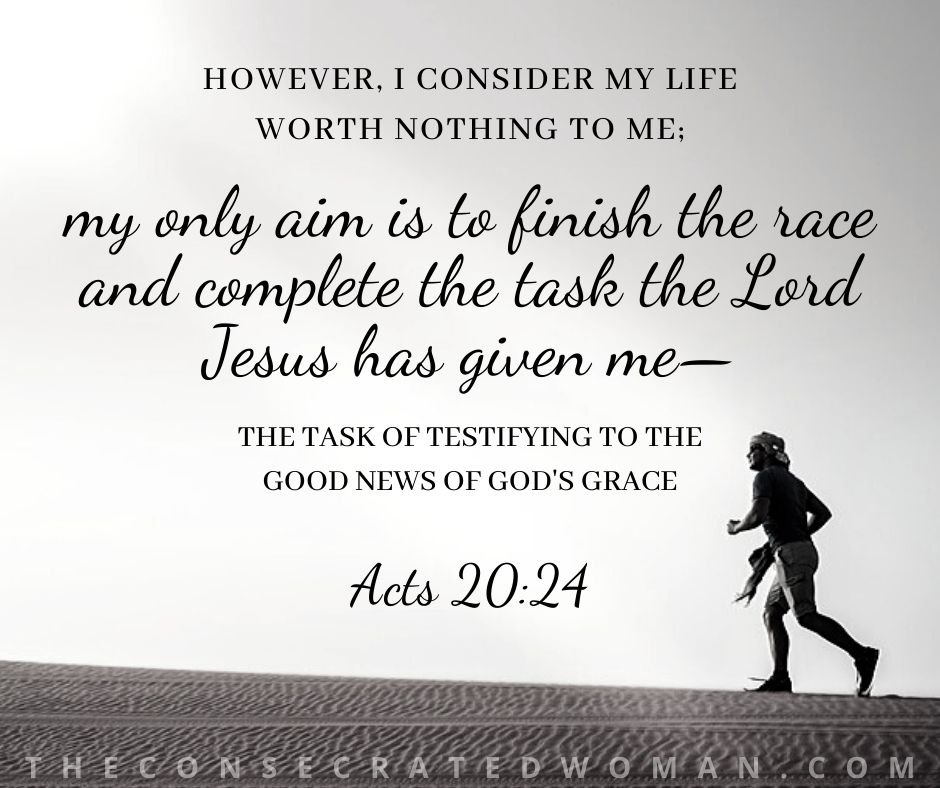 “I do not account my life of any value nor as precious to myself, if only I may finish my course and the ministry that I received from the Lord Jesus” (Acts 20:24).