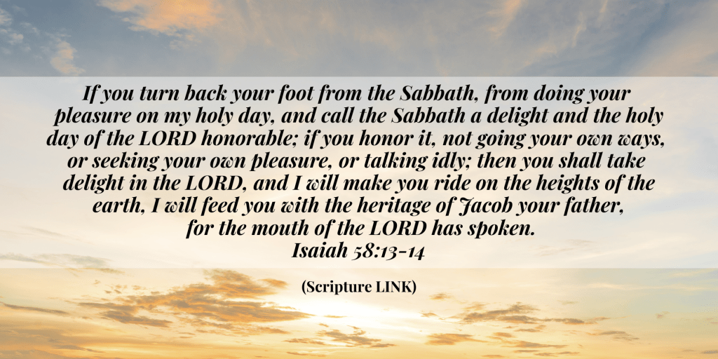 “If you keep your feet from breaking the Sabbath and from doing as you please on my holy day, if you call the Sabbath a delight and the LORD’s holy day honorable, and if you honor it by not going your own way and not doing as you please or speaking idle words, then you will find your joy in the LORD …” (Isaiah 58:13-14).