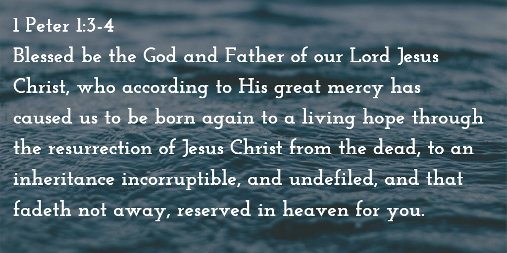 Blessed be the God and Father of our Lord Jesus Christ! According to his great mercy, he has caused us to be born again to a living hope through the resurrection of Jesus Christ from the dead, to an inheritance that is imperishable, undefiled, and  unfading, kept in heaven for you, who by God’s power are being guarded through faith for a salvation ready to be revealed in the last time. In this you rejoice, though now for a little while, if necessary, you have been grieved by various trials, so that the tested genuineness of your faith—more precious than gold that perishes though it is tested by fire—may be found to result in praise and glory and honor at the revelation of Jesus Christ.