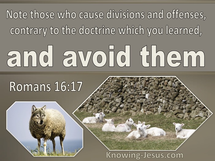 17 Now I urge you, brethren, keep your eye on those who cause dissensions and [a]hindrances contrary to the teaching which you learned, and turn away from them. 18 For such men are slaves, not of our Lord Christ but of their own [b]appetites; and by their smooth and flattering speech they deceive the hearts of the unsuspecting.