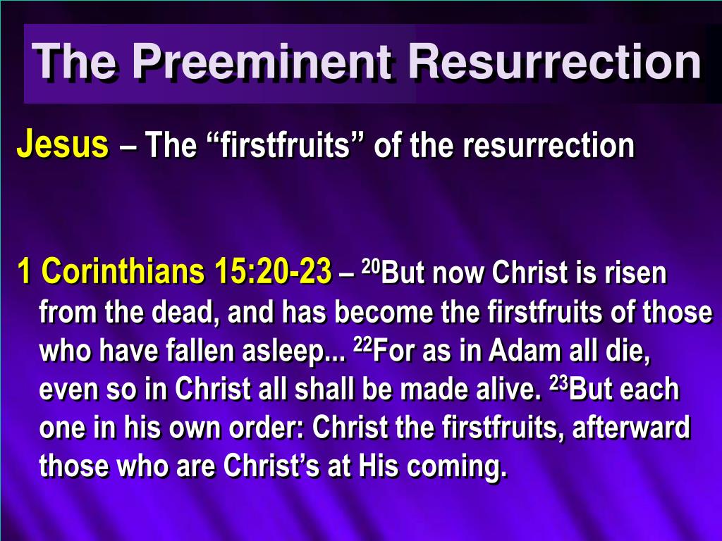16 For if the dead rise not, then is not Christ raised: 17 and if Christ be not raised, your faith is vain; ye are yet in your sins. 18 Then they also which are fallen asleep in Christ are perished. 19 If in this life only we have hope in Christ, we are of all men most miserable. 20 But now is Christ risen from the dead, and become the firstfruits of them that slept. 21 For since by man came death, by man came also the resurrection of the dead. 22 For as in Adam all die, even so in Christ shall all be made alive. 23 But every man in his own order: Christ the firstfruits; afterward they that are Christ’s at his .