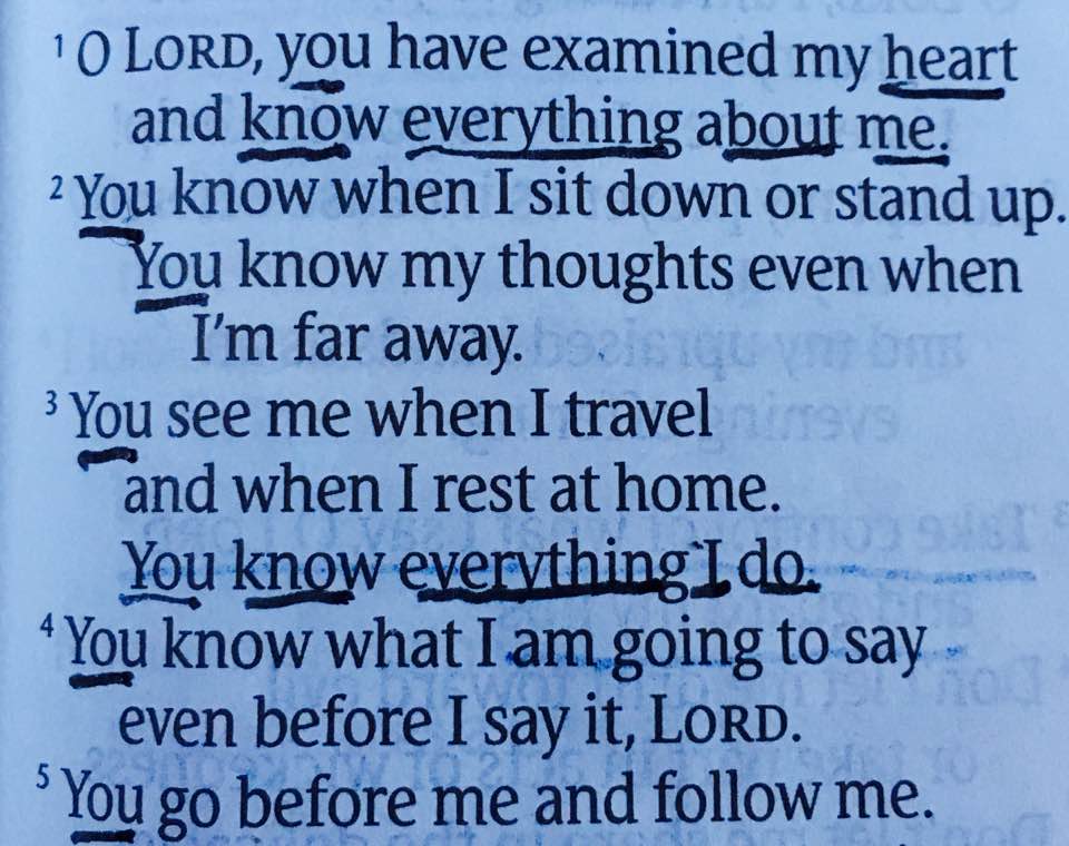 1 You have searched me, Lord, and you know me. 2 You know when I sit and when I rise; you perceive my thoughts from afar. 3 You discern my going out and my lying down; you are familiar with all my ways. 4 Before a word is on my tongue you, Lord, know it completely. 5 You hem me in behind and before, and you lay your hand upon me. 6 Such knowledge is too wonderful for me, too lofty for me to attain.
