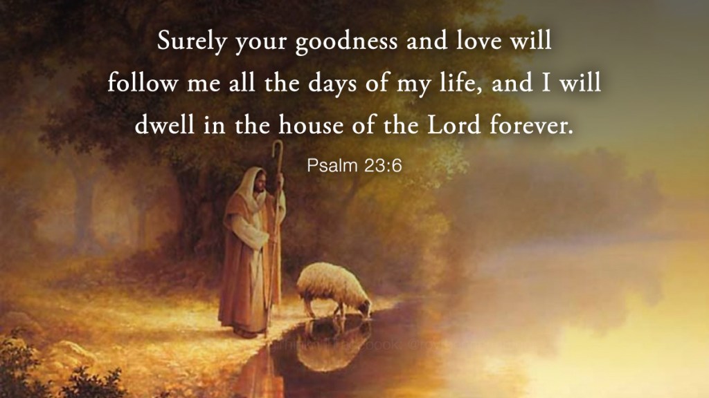 1 The Lord is my shepherd; I shall not want. 2 He maketh me to lie down in green pastures: he leadeth me beside the still waters. 3 He restoreth my soul: he leadeth me in the paths of righteousness for his name’s sake. 4 Yea, though I walk through the valley of the shadow of death, I will fear no evil: for thou art with me; thy rod and thy staff they comfort me. 5 Thou preparest a table before me in the presence of mine enemies: thou anointest my head with oil; my cup runneth over. 6 Surely goodness and mercy shall follow me all the days of my life: and I will dwell in the house of the Lord for ever.