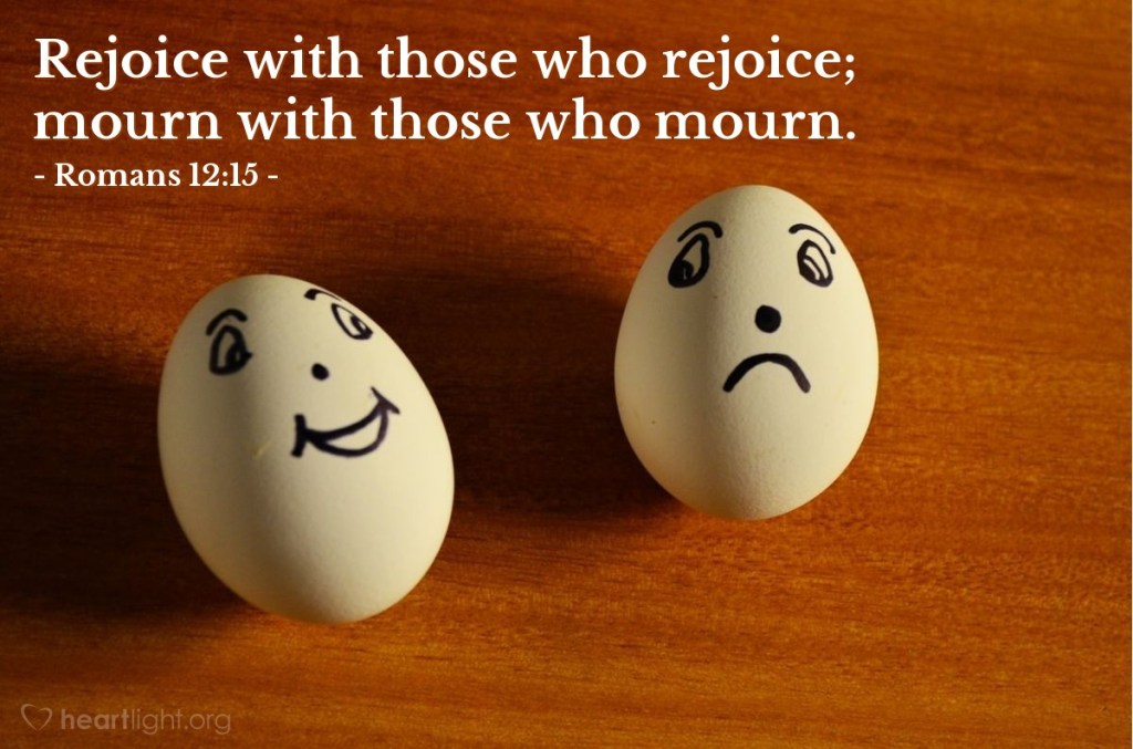 God’s word calls you to “let love be genuine” (Romans 12:9)—and genuine, Christlike love conforms your feelings so that jealousy gives way to joy and apathy to true sympathy playing God’s symphony of peace. Is there anyone who you are standing aloof from in some way, either in their joy or their sadness?